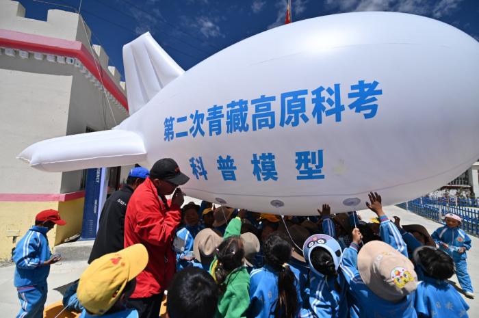 “快看,這個(gè)大白鯨飛起來啦!”,海拔4119米的西藏定日縣扎西宗鄉(xiāng)完全小學(xué)附屬幼兒園里,小朋友們看到緩緩起飛的浮空艇模型興奮地喊著。7月13日上午,中科院珠峰站觀測主管席振華用浮空艇模型、科學(xué)小實(shí)驗(yàn),在這所“珠峰之鄉(xiāng)”幼兒園的新操場上為孩子們上了一堂生動有趣的戶外科普課。