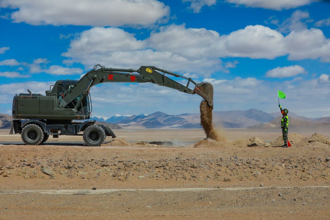 中午時(shí)分,紫外線異常強(qiáng)烈,伴隨著狂風(fēng)卷起的沙粒,打在臉頰陣陣作痛。在茫茫無人區(qū),放眼望去只見官兵來回穿梭在天路的忙碌身影,挖掘機(jī)回填路基、裝載機(jī)運(yùn)送砂石料、平地機(jī)攤鋪路面、壓路機(jī)壓實(shí)路基、瀝青車燒制拌合瀝青……官兵們井然有序,在各自戰(zhàn)位各司其職,一段段損壞的道路隨后就被修復(fù)一新。