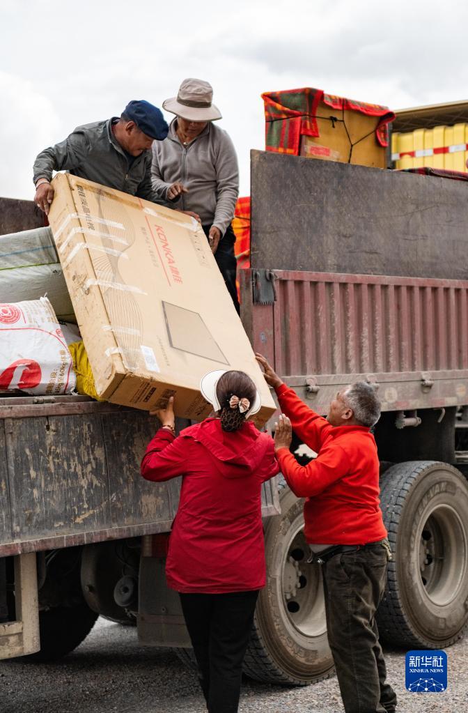 雙湖縣多瑪鄉(xiāng)果根擦曲村的村民將行李搬上貨車(7月12日攝)。新華社記者 周荻瀟 攝