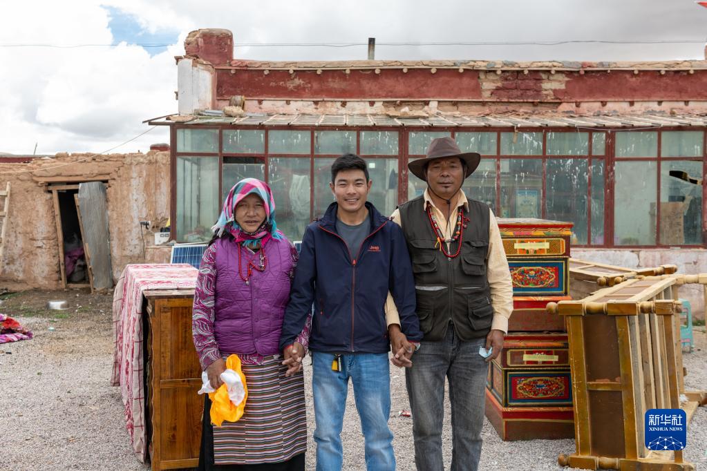 雙湖縣多瑪鄉(xiāng)果根擦曲村牧民貢覺(jué)多吉(中)和父母在老房子前合影。他們搬運(yùn)的家具不多,準(zhǔn)備在新家添置新家具(7月12日攝)。新華社記者 周荻瀟 攝