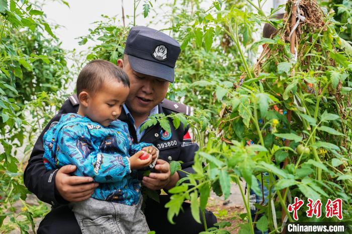 圖為亞?wèn)|出入境邊防檢查站民警與龐達(dá)村雙語(yǔ)幼兒園小朋友共同采摘成熟了的西紅柿。李錦輝 攝