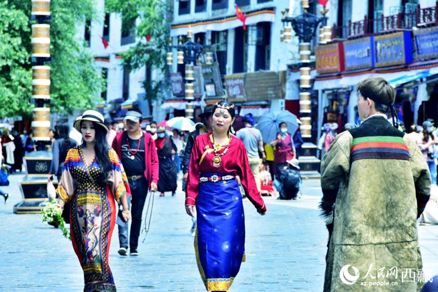 2022年5月,西藏迎來旅游旺季,游客身著藏裝在八廓街拍照留念。人民網(wǎng) 李海霞 攝