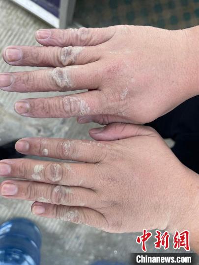 圖為民警被手套泡得發(fā)白的手。西藏日喀則邊境管理支隊(duì) 攝