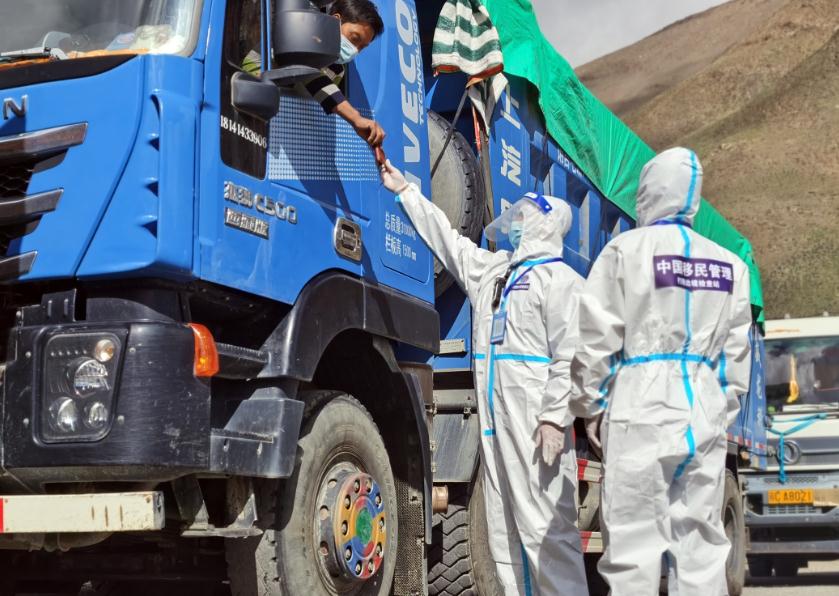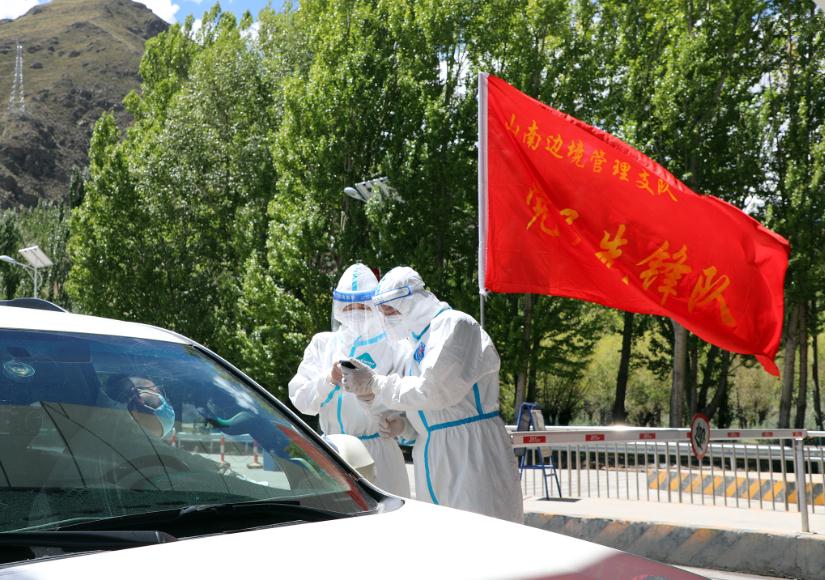 圖為西藏山南邊境管理支隊(duì)機(jī)關(guān)“黨員先鋒隊(duì)”移民管理警察在查驗(yàn)人員核酸檢測報(bào)告。徐道超 攝