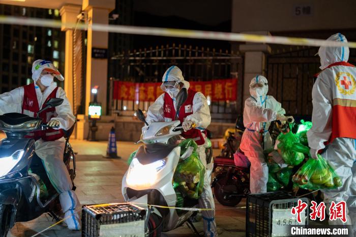 防疫志愿者逐個為居民派送蔬菜水果等生活物資。江飛波 攝