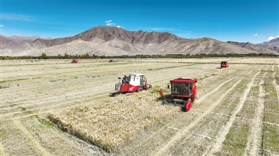 西藏日喀則市江孜縣熱索鄉(xiāng)努康村農(nóng)機(jī)合作社的村民集中對村里三千多畝耕地進(jìn)行機(jī)械化收割新華社記者 晉美多吉攝