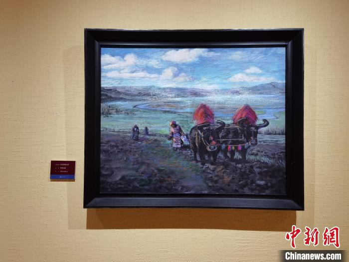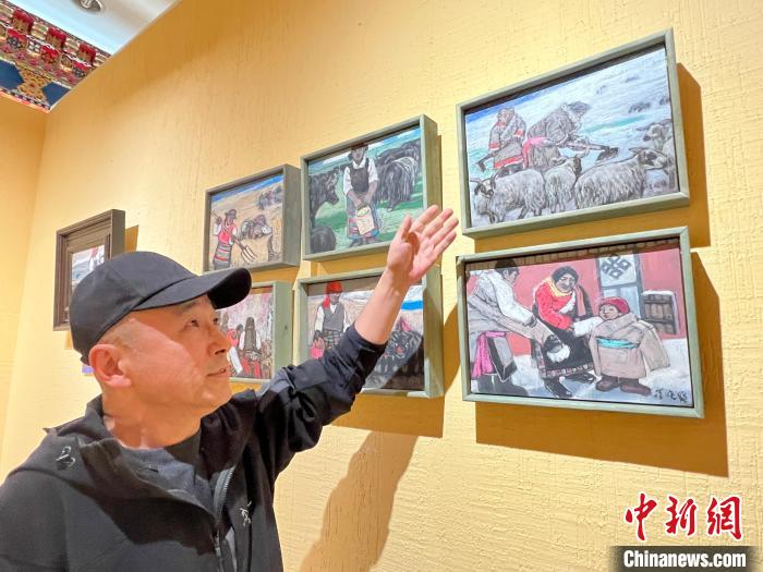 策展人李亞男向中新網(wǎng)記者介紹,崔曉曉首次到西藏那曲便結(jié)識了一位當?shù)嘏笥选?,他將這位藏族青年放牧、添置汽車、蓋新房等畫面用畫筆記錄了下來,在本次展覽中展出。