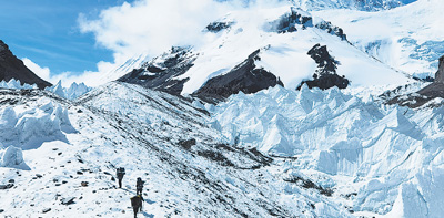科研人員行走在海拔5900多米的冰磧壟上。郭永杰攝(人民視覺)