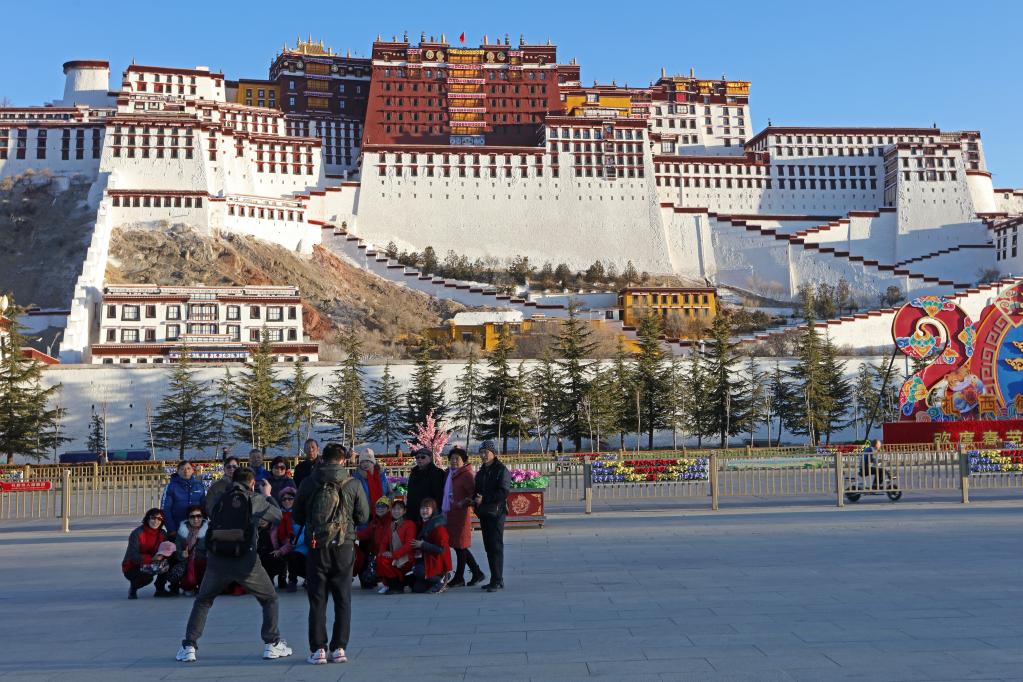 2022年3月7日,游客在布達拉宮廣場合影留念。新華社記者 姜帆 攝
