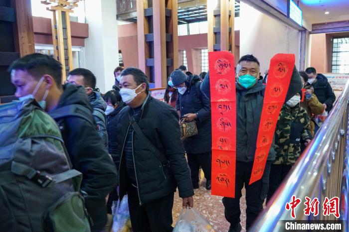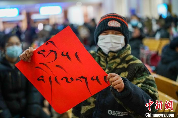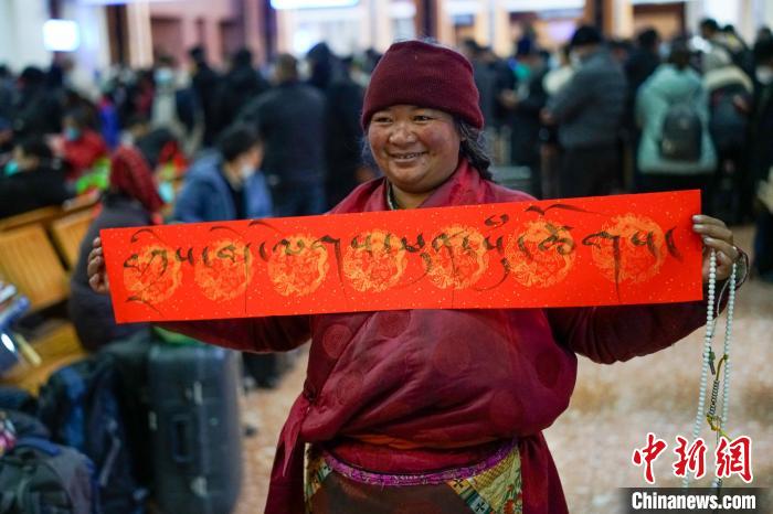 圖為春運首日,拉薩火車站一旅客獲得車站送的藏式春聯(lián),上面書寫的是藏語“扎西德勒 吉祥如意”?!〗w波 攝