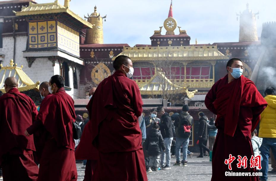 1月12日,西藏拉薩,來自青海玉樹的僧人們正在大昭寺前準(zhǔn)備合影留念。 李林 攝