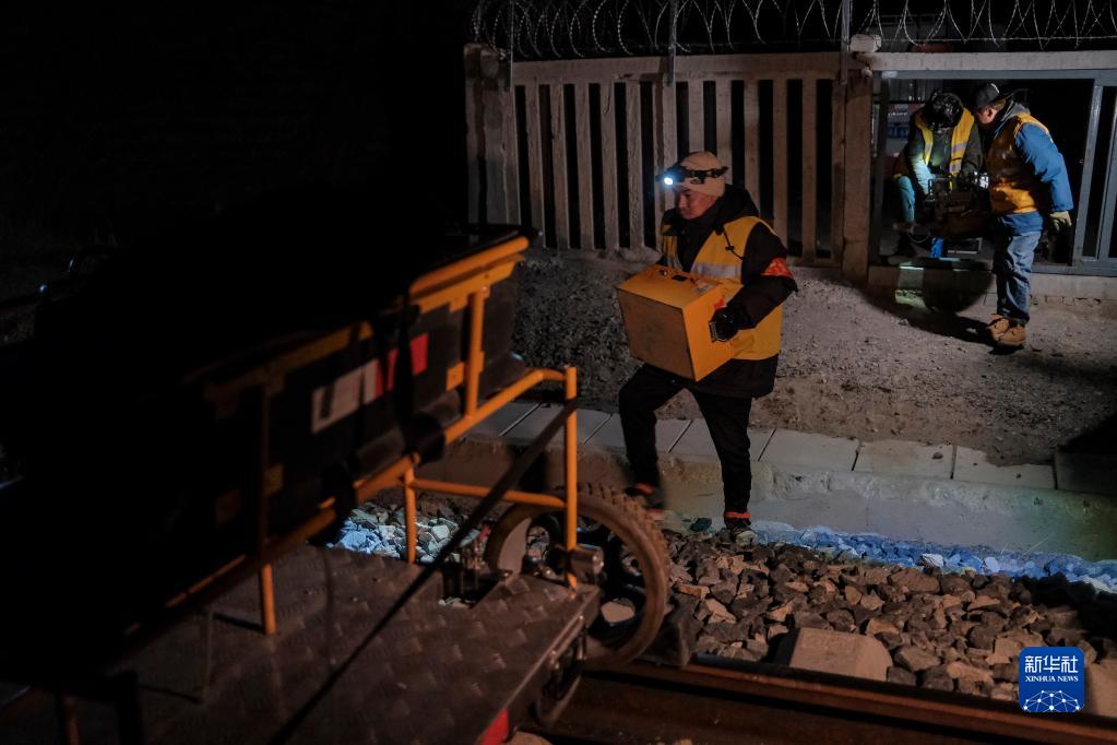 羅布和同事進(jìn)行鋼軌探傷前的準(zhǔn)備工作(1月12日攝)。新華社記者 孫非 攝