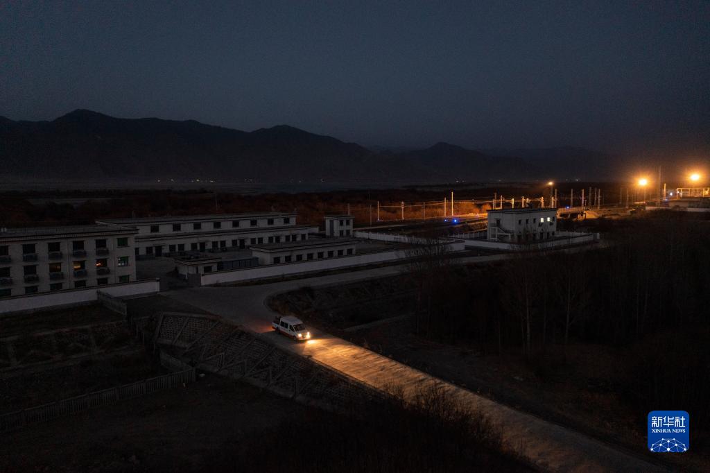 羅布和同事駕車駛出拉林鐵路扎囊工電綜合工區(qū),趕往鋼軌探傷作業(yè)點(diǎn)(1月12日攝,無人機(jī)照片)。新華社記者 孫非 攝
