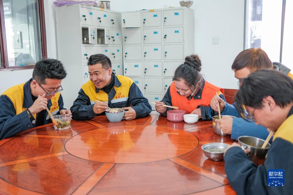在拉林鐵路扎囊工電綜合工區(qū),羅布(左二)和同事一起吃晚飯(1月12日攝)。新華社記者 孫非 攝