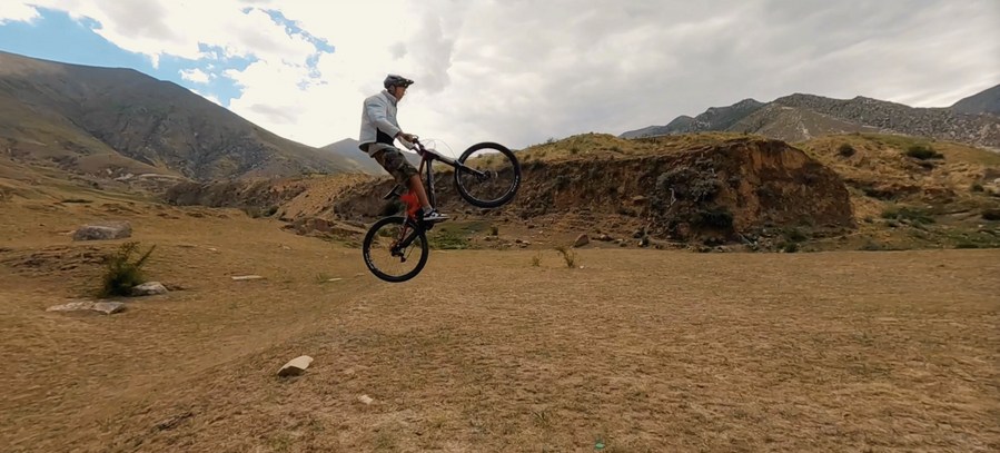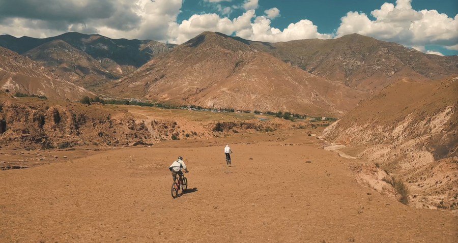 乘著風(fēng),沿著山脊速降,自行車始終徘徊在失控邊緣,旦增吉米需要不斷調(diào)整、控制。