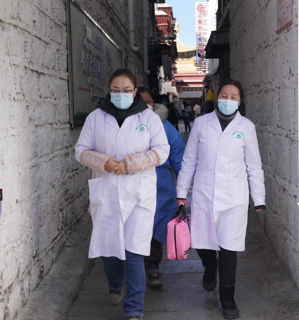 拉薩市八廓街道內(nèi),醫(yī)生拉吉(右一)和她的同事們?cè)谌霊綦S訪途中。新華社記者黃耀漫 攝