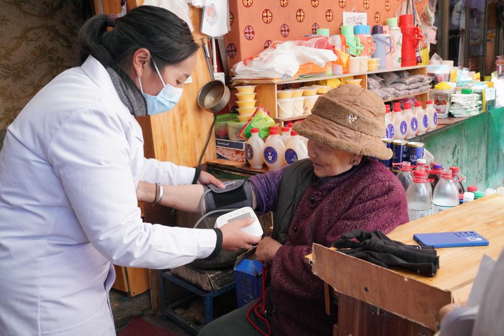 醫(yī)生為拉薩市八廓街道居民次仁卓瑪(右)測(cè)量血壓。新華社記者黃耀漫 攝