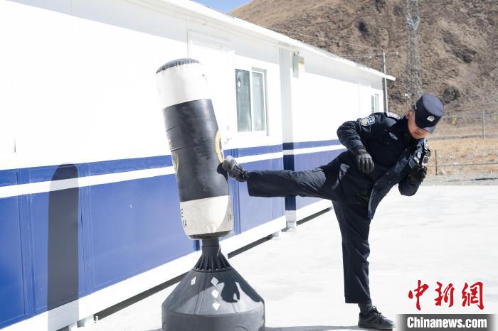 圖為羅布日常鍛煉打拳,他背后是去年12月新建的板房。 貢嘎來(lái)松 攝