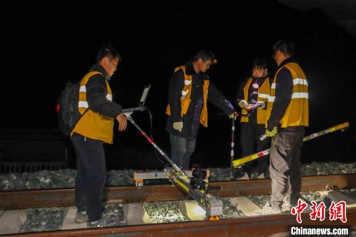 圖為2月9日晚,工作人員在西藏拉林鐵路線上進(jìn)行設(shè)備檢查作業(yè)?!●R生明 攝