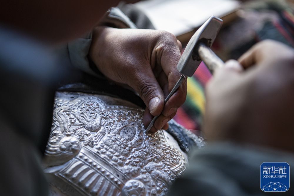 在扎西吉彩金銀銅器廠,一名手工藝人在給銀器鏨刻花紋(3月9日攝)。