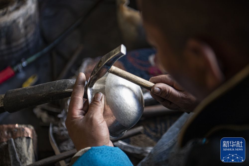 在扎西吉彩金銀銅器廠,一位手工藝人在檢查自己打制的銀器坯子(3月9日攝)。