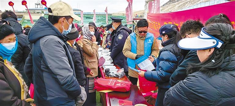 山南市錯(cuò)那縣“鑄牢中華民族共同體意識 慶祝西藏百萬農(nóng)奴解放紀(jì)念日”活動現(xiàn)場,各宣傳點(diǎn)給群眾發(fā)放宣傳資料。記者 旦增蘭澤 攝