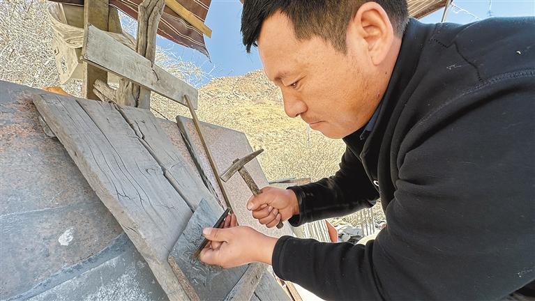 今年35歲的桑周才仁出生在石刻世家,父輩都是石匠,算起來他也是家族石刻技藝的第六代傳承人了。自幼,桑周才仁就對(duì)石頭有一種特殊的情感,14歲就開始接受父親的指導(dǎo),悉心學(xué)習(xí)刻字、線雕、浮雕、繪畫等與石刻相關(guān)的技藝?!翱套质鞘碳妓囍械幕A(chǔ),需要反復(fù)練習(xí),刻不好就得磨掉重做,直到刻出滿意的作品為止?!鄙V懿湃蕦?duì)記者說,當(dāng)時(shí)聽到父親一句“刻得很好”的評(píng)價(jià),他就能高興一整天。