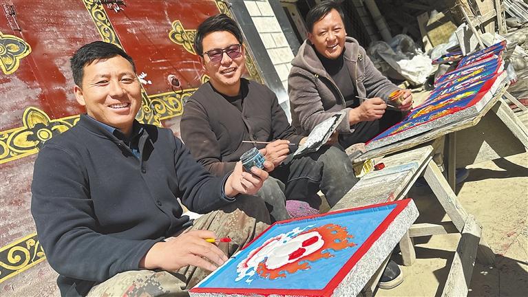 桑周才仁(左一)和徒弟們一起為石刻作品上色。