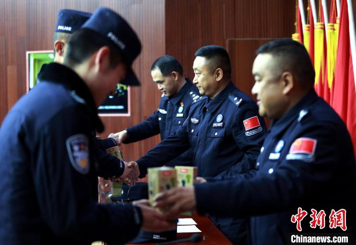 3月31日,邊檢站領(lǐng)導(dǎo)通過授章考核的移民管理警察授章。 肖富貴 攝