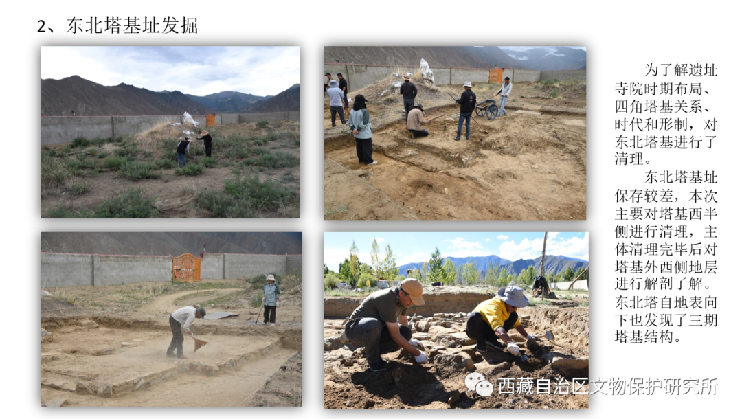 2022年,溫江多考古隊(duì)對(duì)遺址西南塔北側(cè)塔基、東北塔基址進(jìn)行了清理發(fā)掘,對(duì)遺址中區(qū)西部地層進(jìn)行了解,對(duì)遺址南部五峰山部分區(qū)域進(jìn)行了調(diào)查。發(fā)掘面積520平方米,出土磚、瓦、陶、石、骨、鐵等各類遺物標(biāo)本100件。西南角和東北角兩座佛塔均發(fā)現(xiàn)了上下疊壓的早、中、晚三期塔基,兩座塔基的平面形制和規(guī)格基本一致,均為平面呈多折角“亞“字形,土石結(jié)構(gòu)塔基,邊長(zhǎng)均長(zhǎng)約18米。遺址中區(qū)西部T0905探方內(nèi)清理出墻址2處,臺(tái)基1處。兩道墻址一為南北向夯土墻,一為東西向石墻,均位于④層下,與晚期塔基為同一時(shí)期。臺(tái)基1位于⑥層下,北部為一道東西向石砌臺(tái)基,內(nèi)部(南)為五花墊土層,與早期佛塔為同時(shí)期。調(diào)查工作在五峰山頂發(fā)現(xiàn)修行洞、修行點(diǎn)、小型塔基等共8處,在山北麓發(fā)現(xiàn)依山修建的具有一定規(guī)模的房居址、大型佛塔基址等共5處。