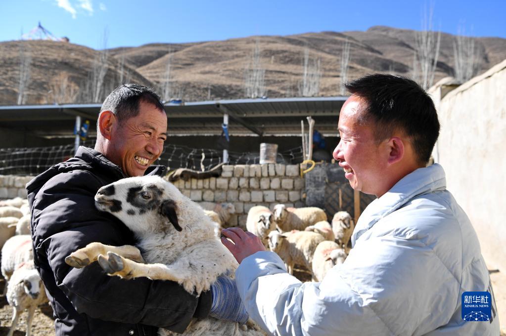 西卡學(xué)村養(yǎng)殖合作社負(fù)責(zé)人邊覺(左)在向西卡學(xué)村黨總支第一書記兼駐村工作隊副隊長李德林介紹綿羊養(yǎng)殖及銷售情況(4月5日攝)。新華社記者 張汝鋒 攝
