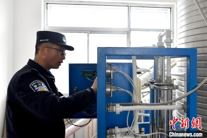 民警李加潘正在檢修保養(yǎng)自來水凈化設備?!±盍?攝