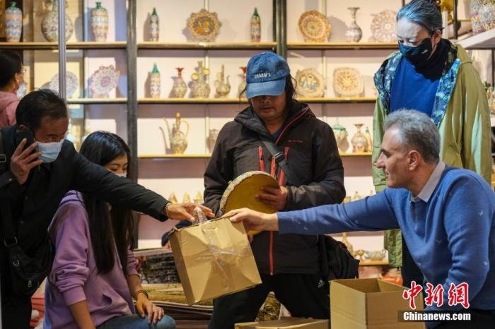 5月4日,西藏(拉薩)中外商品展銷會(huì)現(xiàn)場,伊朗商戶哈桑(前排右)給顧客打包好商品,后面貨架是他銷售的伊朗特色工藝品。中新社記者 江飛波 攝