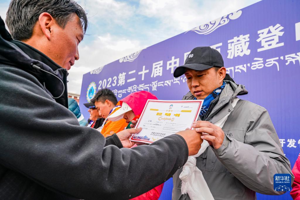 5月3日,工作人員向登山愛(ài)好者頒發(fā)登頂證書。新華社記者 孫非 攝