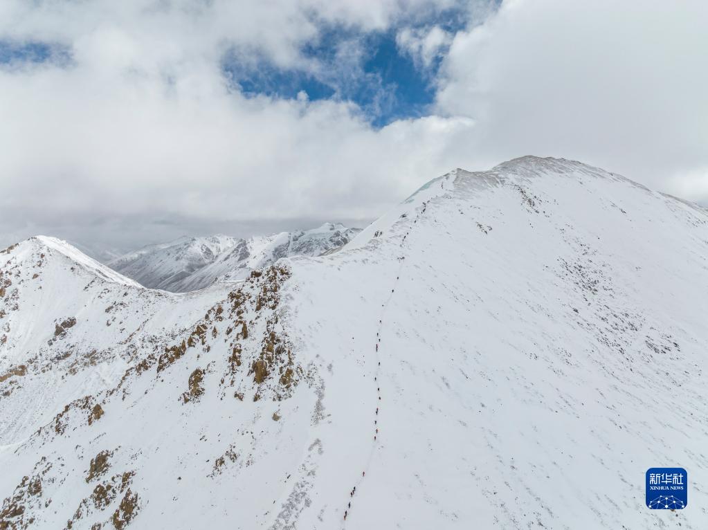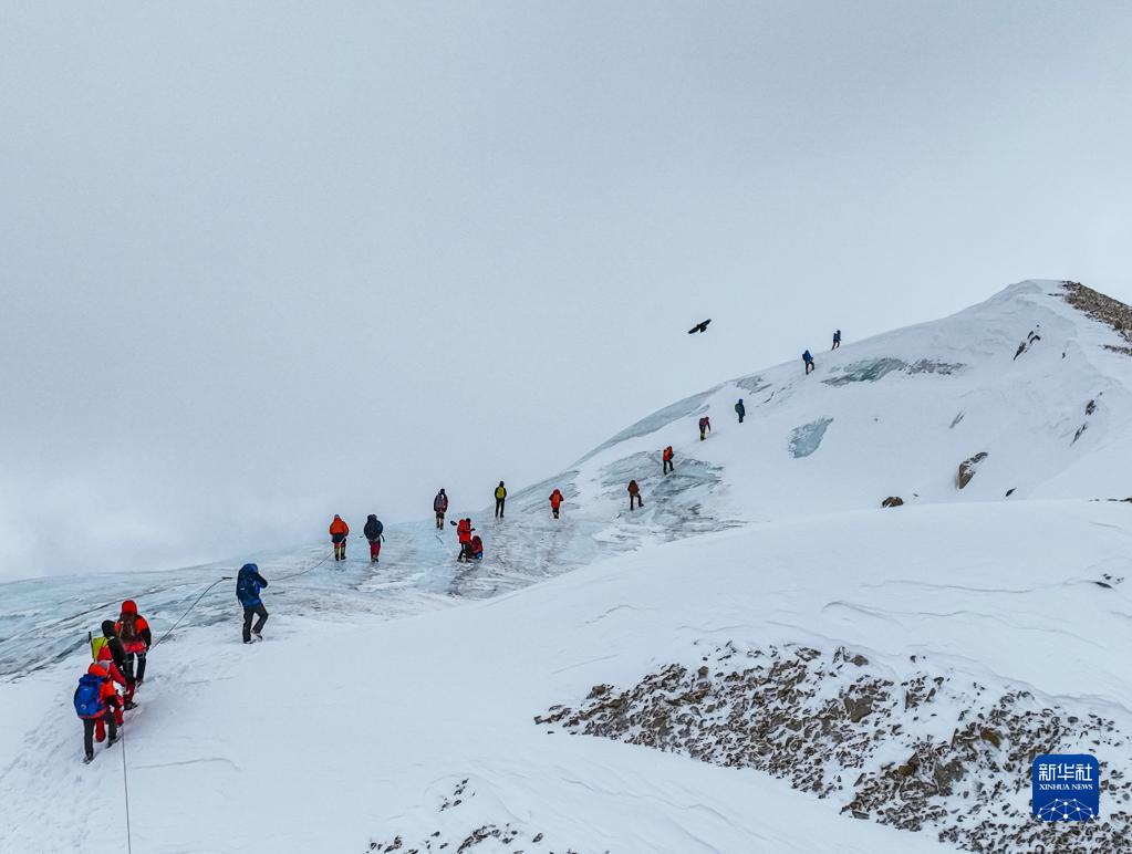 5月3日,登山愛(ài)好者正在向海拔6010米的洛堆峰峰頂進(jìn)發(fā)(無(wú)人機(jī)照片)。新華社記者 孫非 攝
