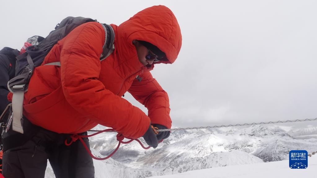 5月3日,一名登山愛(ài)好者在路繩上掛上升器。新華社記者 黃耀漫 攝