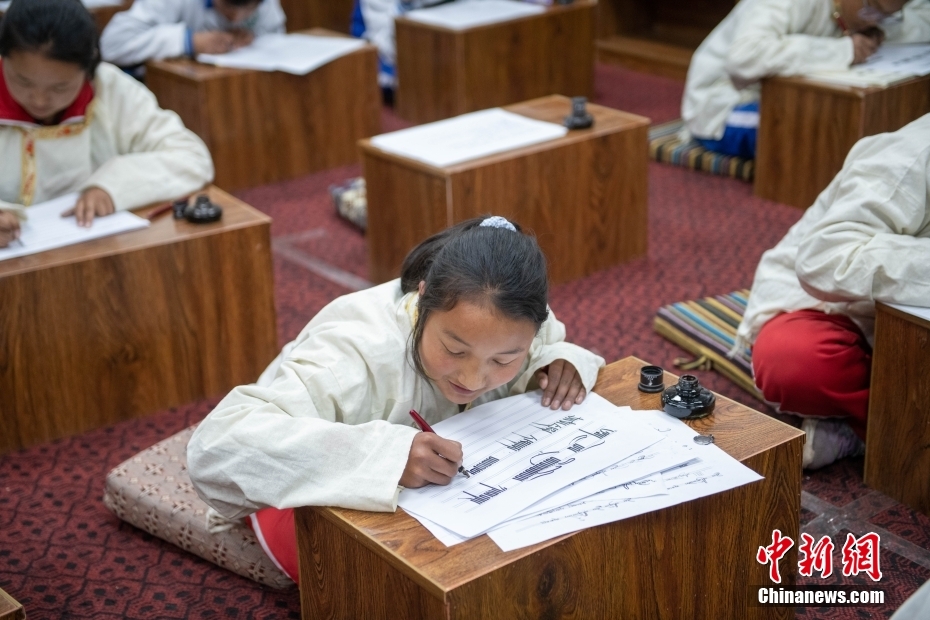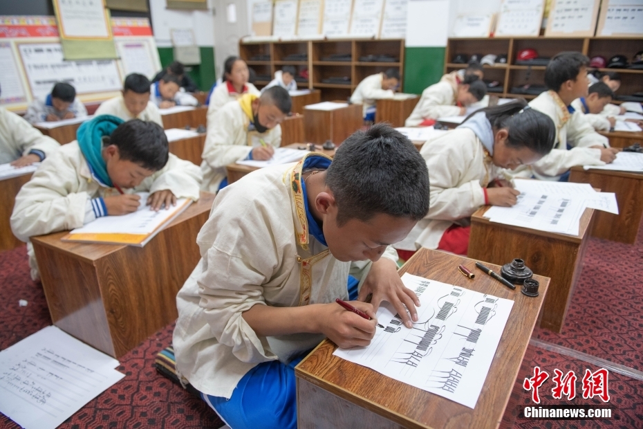 5月7日,西藏山南市,加查縣中學(xué)學(xué)生在上藏文書(shū)法興趣班。該興趣班由2名藏文教師任教,每周兩課時(shí),利用自習(xí)課或晚自習(xí)時(shí)間為學(xué)生和教師授課。課程內(nèi)容包含執(zhí)筆、運(yùn)筆、姿勢(shì)等基礎(chǔ)書(shū)寫(xiě)技能,以及藏文中的烏金體、珠擦體、簇仁體、簇通體等各類字體的書(shū)寫(xiě)方法。