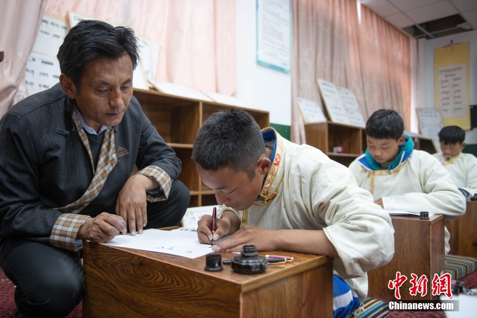 5月7日,西藏山南市,加查縣中學(xué)藏文書(shū)法興趣班的教師扎西達(dá)瓦(左一)對(duì)學(xué)生進(jìn)行指導(dǎo)。該興趣班由2名藏文教師任教,每周兩課時(shí),利用自習(xí)課或晚自習(xí)時(shí)間為學(xué)生和教師授課。課程內(nèi)容包含執(zhí)筆、運(yùn)筆、姿勢(shì)等基礎(chǔ)書(shū)寫(xiě)技能,以及藏文中的烏金體、珠擦體、簇仁體、簇通體等各類字體的書(shū)寫(xiě)方法。