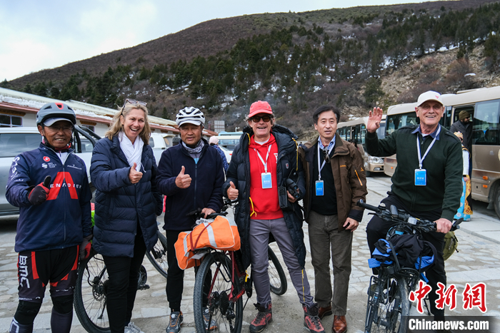 圖為5月17日,參訪團成員在林芝魯朗觀景臺與騎行國道318線的旅行者合影。 中新社記者 江飛波 攝