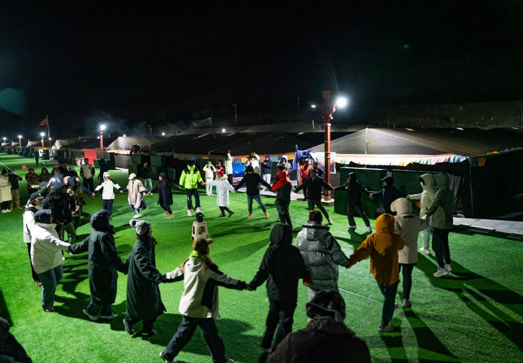 在珠峰游客大本營,游客們在帳篷旅館間的空地上唱歌跳舞(5月16日攝)。新華社記者孫非 攝
