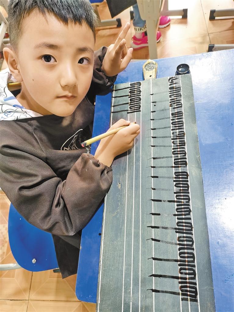 今年10歲的扎西次仁和他的同學(xué)們席地端坐,左手握木制藏文書寫板,右手持竹筆,一起認(rèn)真練習(xí)尼赤派書法。扎西頓珠平時(shí)利用閑暇時(shí)間在家免費(fèi)教授書法?!昂⒆幽茉趪壹壏沁z傳承人門下學(xué)習(xí)藏文書法,機(jī)會(huì)難得,我們?nèi)胰朔浅VС郑卜浅s幸。孩子也學(xué)得非常認(rèn)真?!笔忻窭纺弥鴥鹤觿倢懞玫臅ㄗ髌犯锌?。