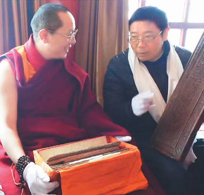 項目總顧問丁真俄色(左)與西藏自治區(qū)古籍保護中心研究館員、古籍專家白張?zhí)接懝偶Wo。
