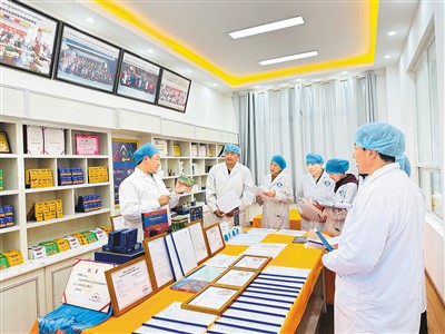 平措饒吉(左一)在介紹作為項目成果轉化的藏醫(yī)藥品。