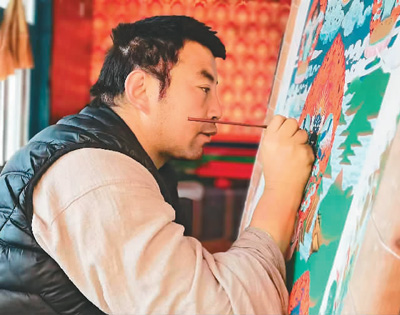 象雄唐卡畫家嘎松旺加在繪畫唐卡。據介紹,唐卡畫風的傳承最早可追溯到古象雄時期,其佛像繪制主要依據了《古象雄大藏經》中的度量法。