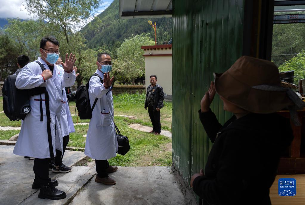 6月12日,王振疆醫(yī)生一行離開時(shí),病人阿珍的女兒(右)和他們揮手告別。新華社記者 晉美多吉 攝