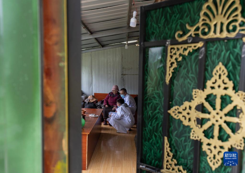 6月12日,王振疆(前右二)、王彤旭(前左一)、陳冰(前右一)和尼瑪益西(前左三)在村委會(huì)會(huì)議室為患者診治。新華社記者 費(fèi)茂華 攝