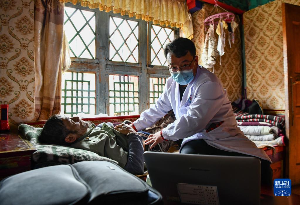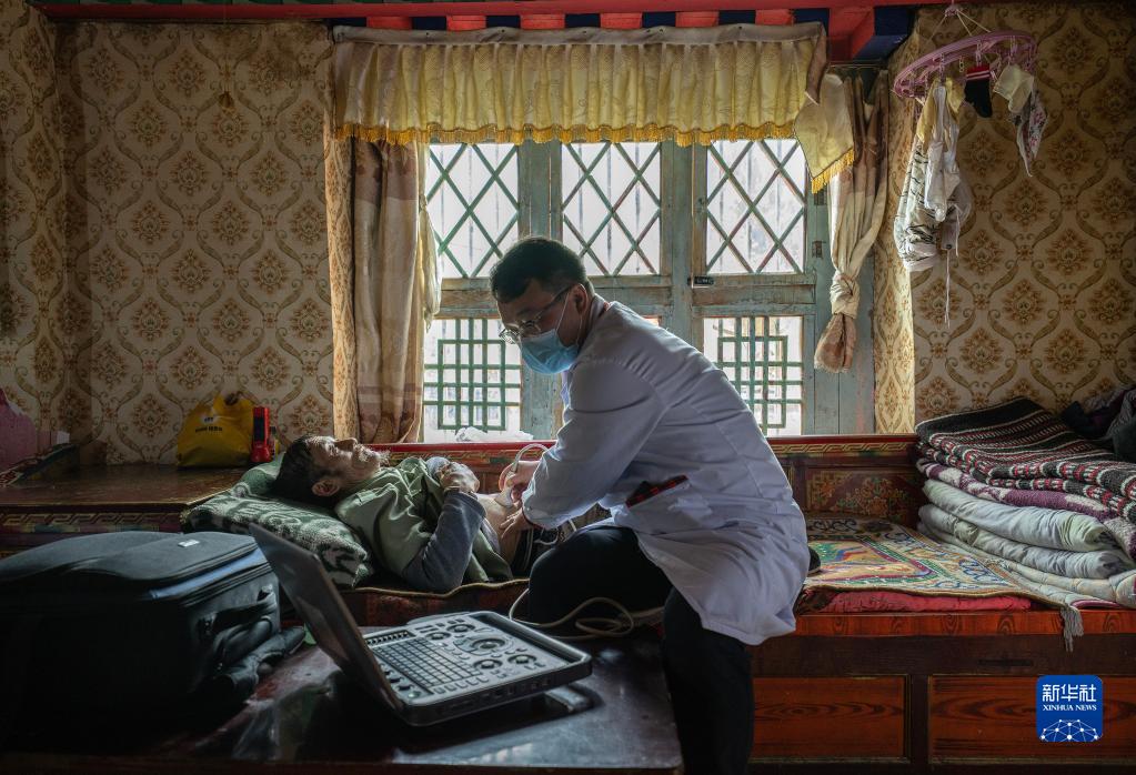 6月12日,王彤旭在吞不絨村為珠杰診治。新華社記者 費(fèi)茂華 攝