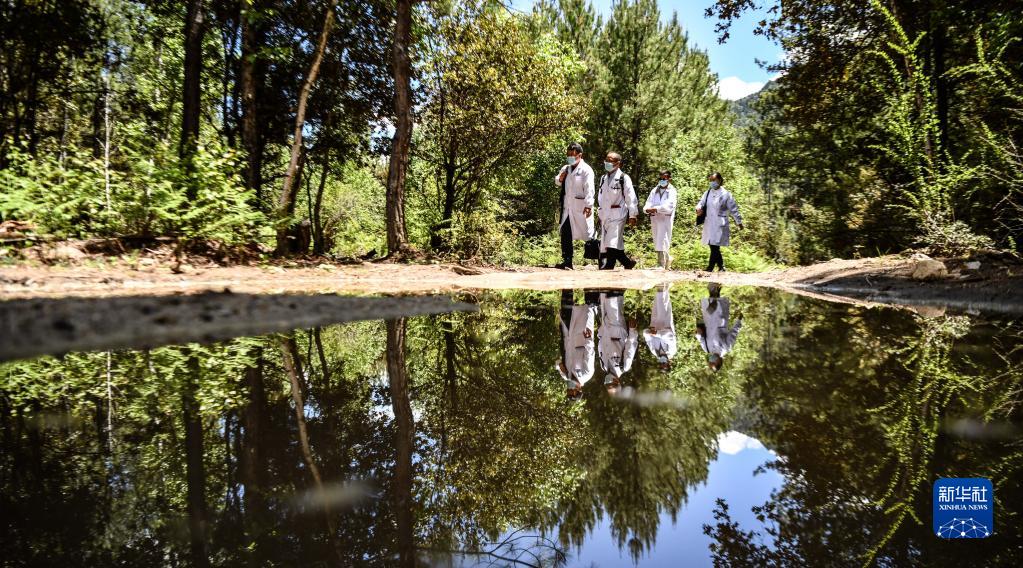 6月12日,王振疆(右一)、王彤旭(右二)、陳冰(右三)和尼瑪益西在樹林間行走。新華社記者 費(fèi)茂華 攝