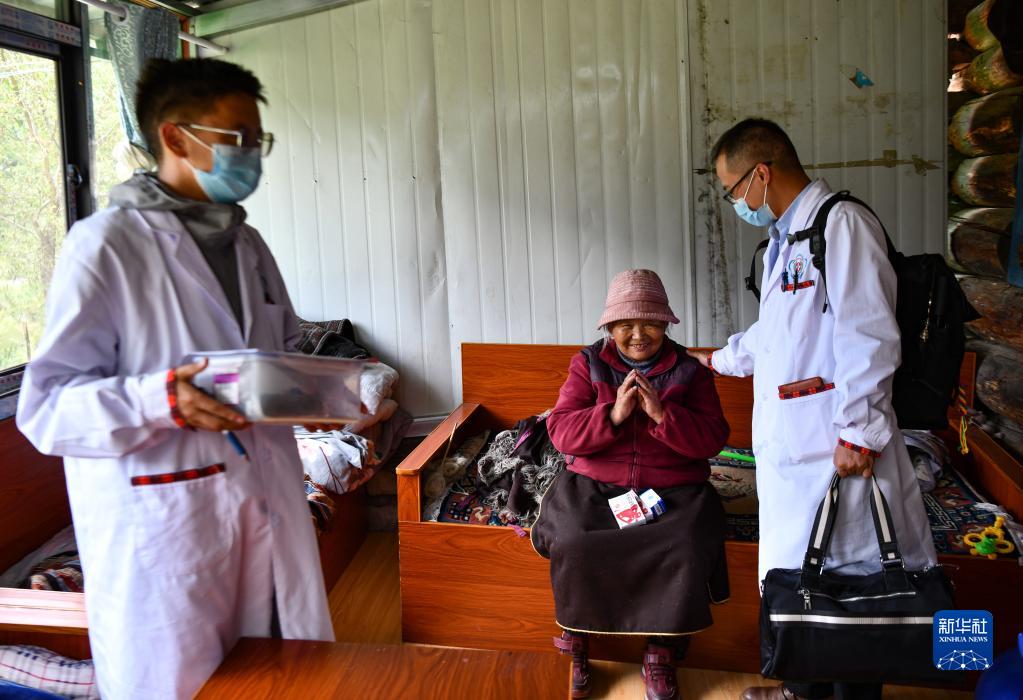 6月12日,王振疆(右)為吞不絨村89歲的村民娘姑進(jìn)行檢查。新華社記者 費(fèi)茂華 攝