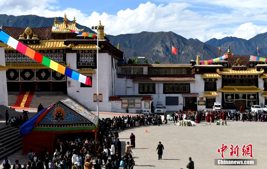 圖為6月12日,信眾在昌都強(qiáng)巴林寺排隊等待班禪摸頂賜福。